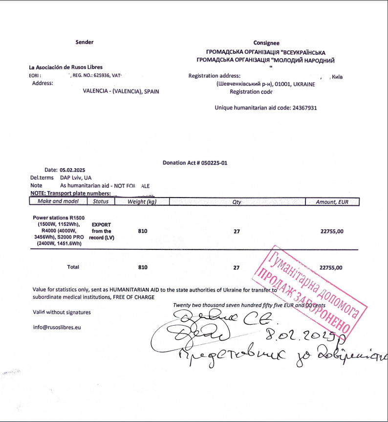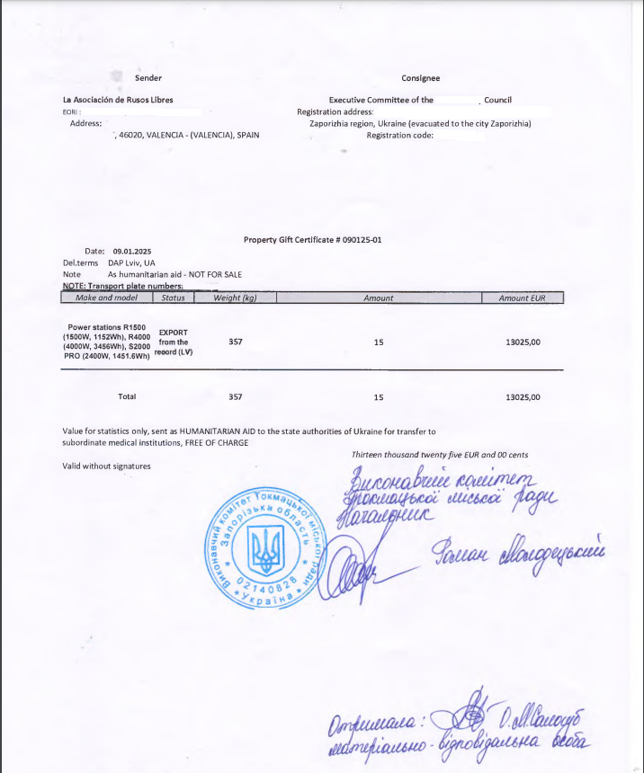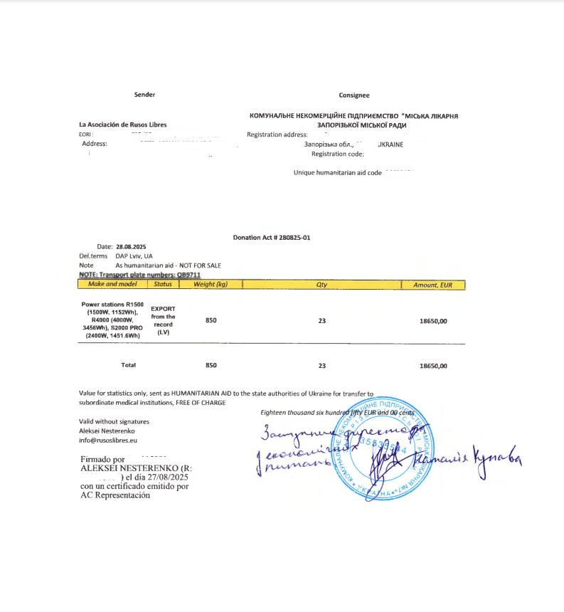 Here are the documents confirming that the power stations purchased with your donations have been delivered to hospitals and schools.